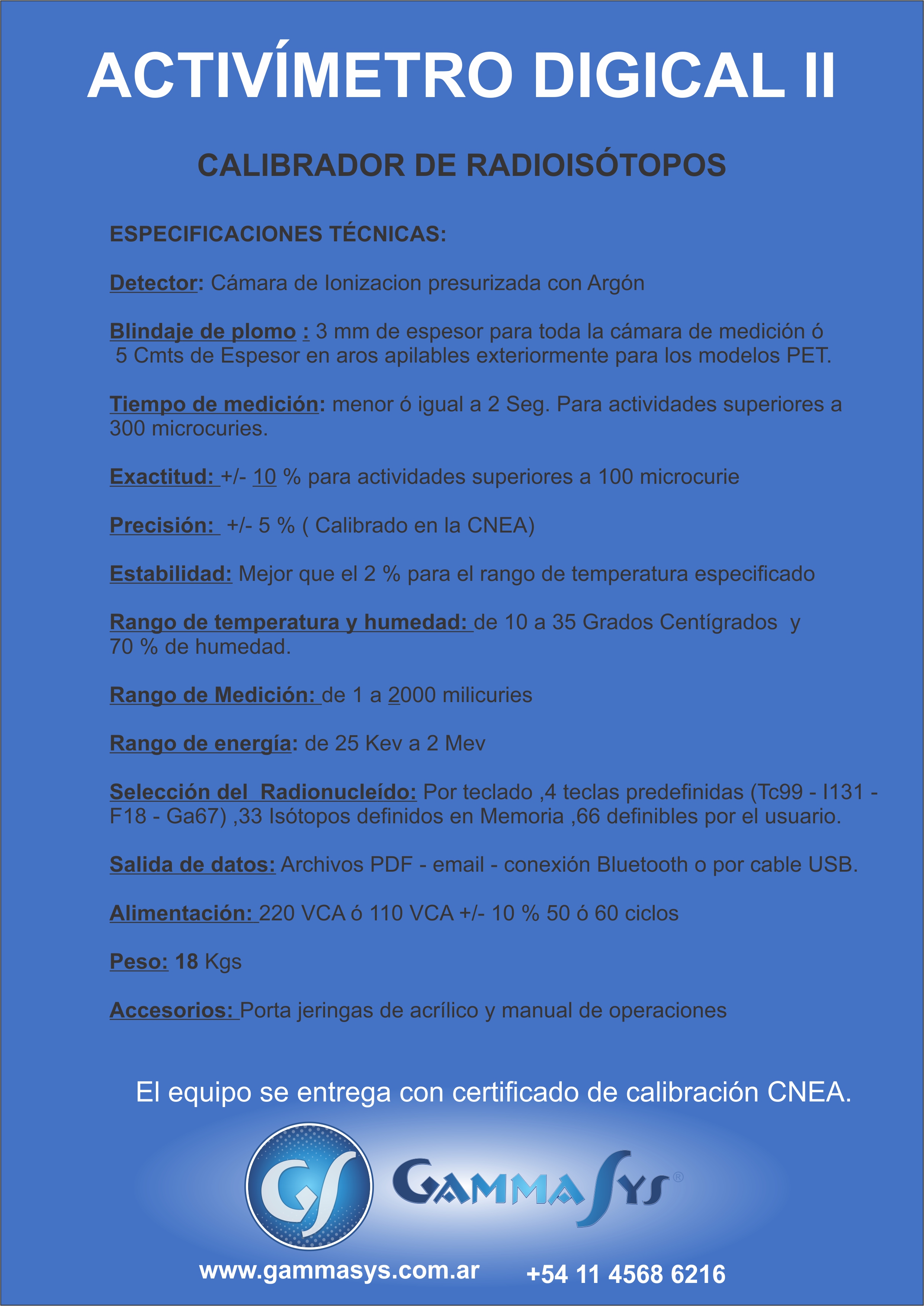 El El ACTIVÍMETRO DIGICAL II o Calibrador de Dosis, es un instrumento diseñado para la medición de la radioactividad de distintos radionucleídos usados en Medicina Nuclear que han de suministrarse a los pacientes, por lo que es imprescindible garantizar la fiabilidad de sus mediciones. Incluye capacidad de medición y blindaje para isótopos emisores de 511 KeV para aplicaciones en PET.